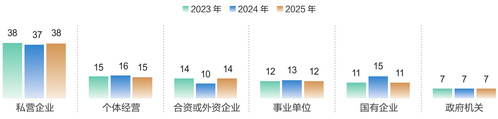 上市企业、大型企业、合资或外资企业是目前留学生主要倾向的工作单位类型。其中,大型企业、合资或外资企业,分列“最倾向的工作单位性质”前两名,这反映了企业的规模和国际化水平是留学生选择工作单位时特别关注的因素。