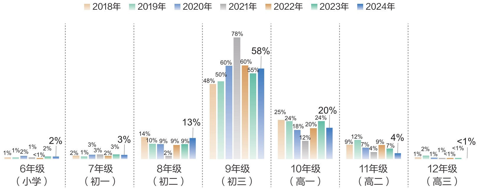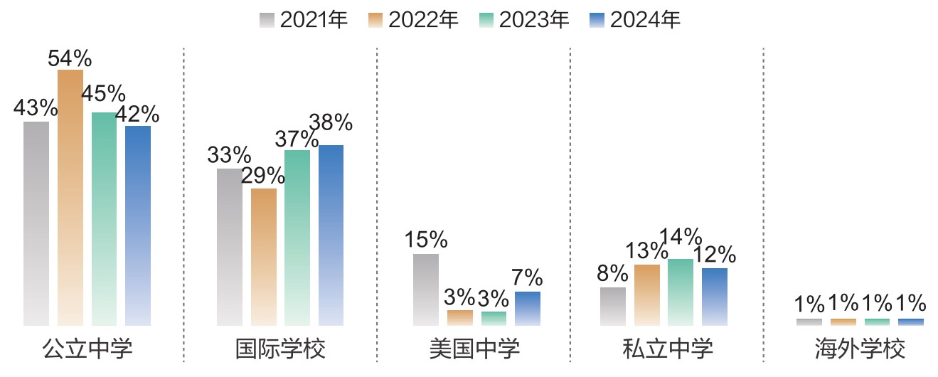 2024年,公立中学与国际学校的学生依然为美国中学主要申请群体。其中,来自公立中学学生的申请占比连续三年下降,但仍占据主导位置。超三成公立中学的学生选择申请入读10年级、11年级,这类学生通常为受国内学籍、户籍等因素限制,无法升读优质高中的群体;或中考失利、对现就读高中不满意、想更换赛道的学生;或偏科严重、无缘国内优质本科、将美国中学作为升学跳板的学生。国际学校在近几年来呈现出增长趋势,2024年达到了近年最高值38%,已接近公立中学生源。