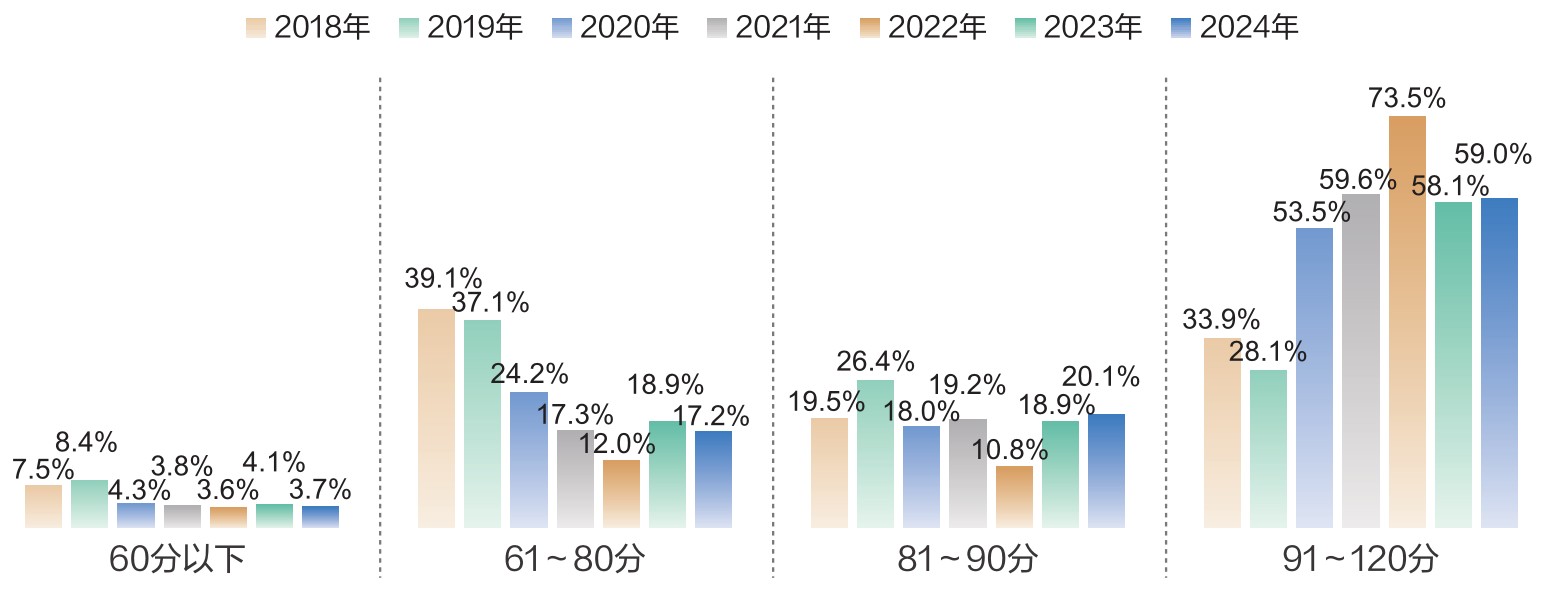 2018年~2024年美国中学申请——TOEFL考试成绩占比