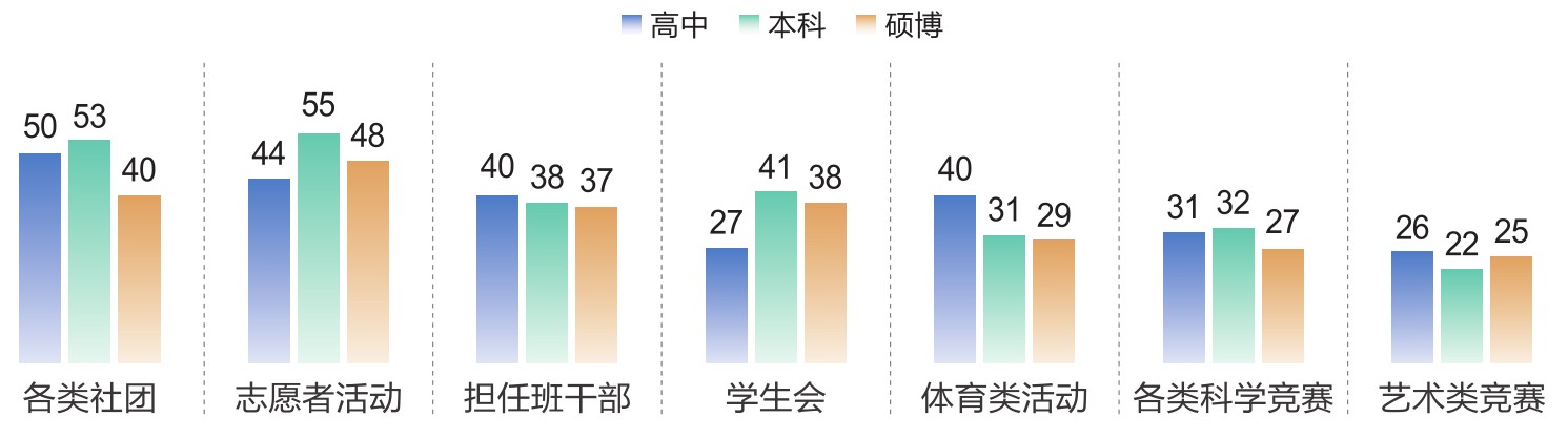 此外,本科生和硕博生对校园活动也比较热衷。本科生更倾向参与志愿者活动、社团和学生会,这有助于体现他们较强的社会责任感,并提升他们的组织能力和领导力。志愿者活动同样也是硕博生的主要选择,这可能与他们的学术压力较大有关,志愿者活动既能为社会做贡献,丰富个人经历,又不会过多占用他们的研究时间。这些活动经历都会对他们未来的求职深造提供一定助力。