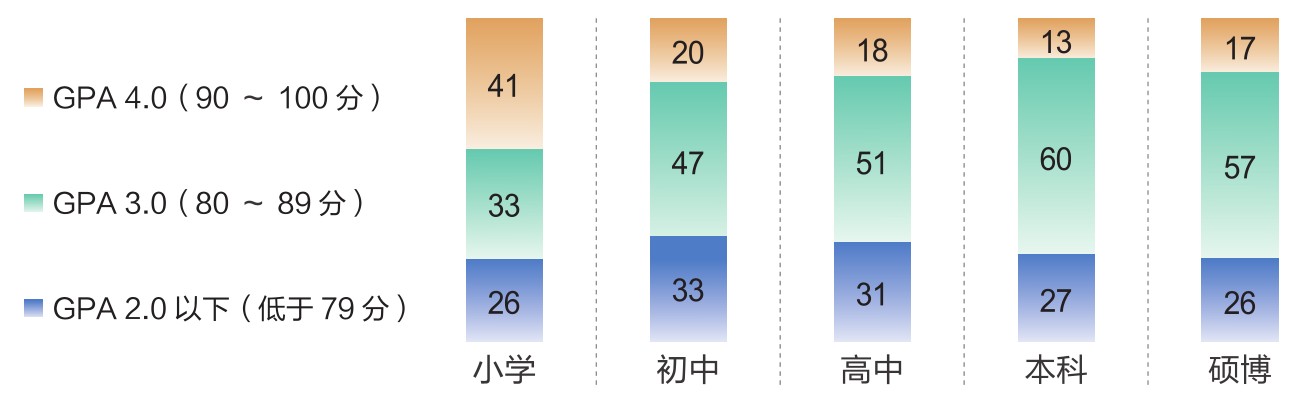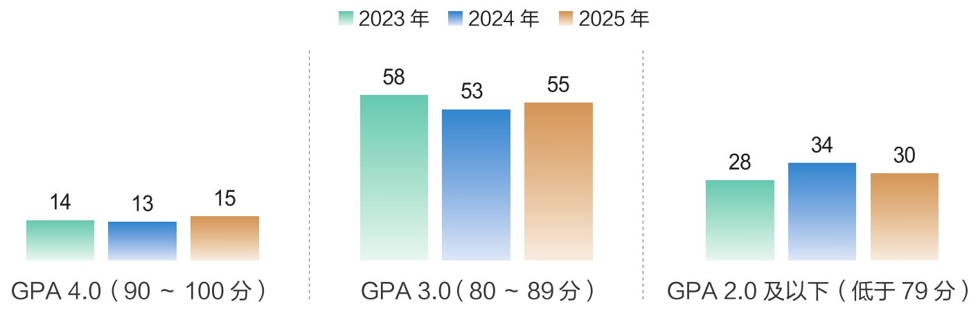 通过对不同年份、不同年级留学意向人群的学习成绩进行分析,可以发现这些学生在学术上普遍表现出色,特别是GPA 3.0及以上的比例较高。在2025年,GPA成绩在3.0和4.0的人群占比均上升2%。且随着年级的不断升高,意向留学人群在学习成绩上的优势也更加明显。