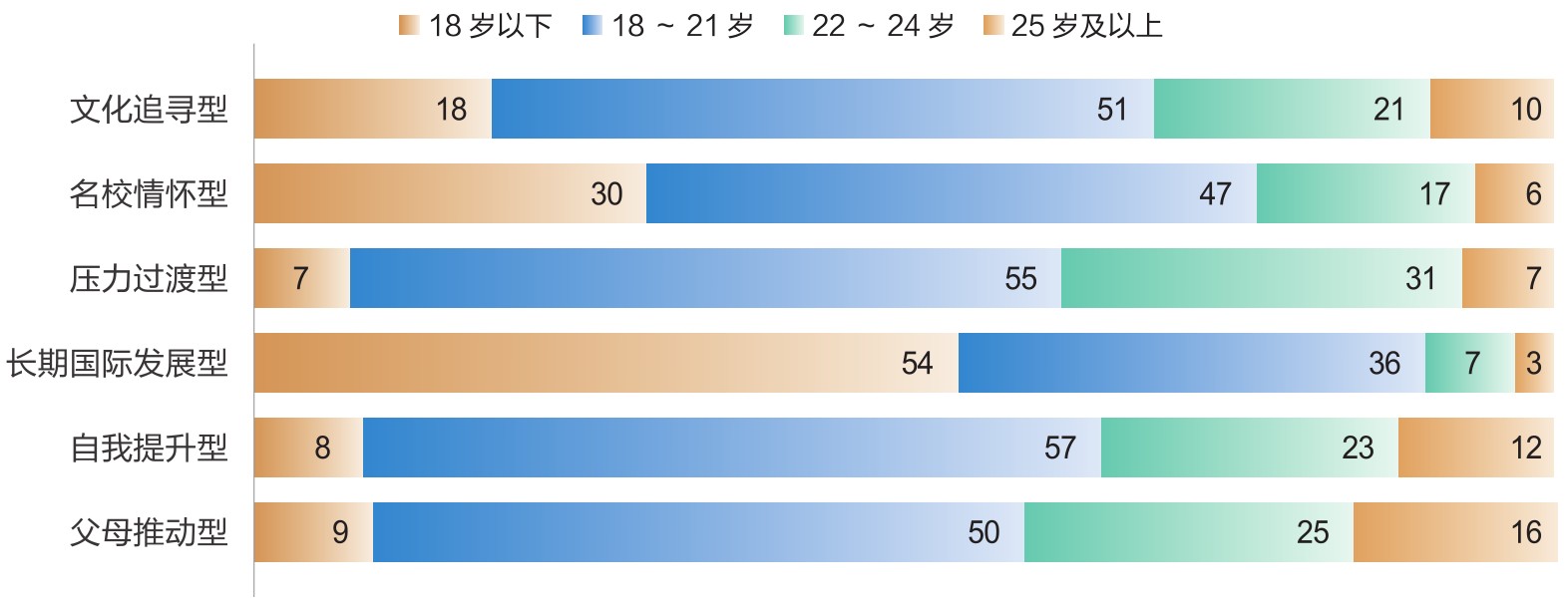 从性别来看,“自我提升型”和“压力过渡型”人群中女生占比较高,一定程度上也反映出当下时代的女性具有更强烈的进取心和求知欲。她们倾向于通过留学来提升自己的学术能力、语言技能以及跨文化交流能力等方面的个人素质,也更愿意对自己的教育和技能提升进行投资,以实现事业和生活上的成功。