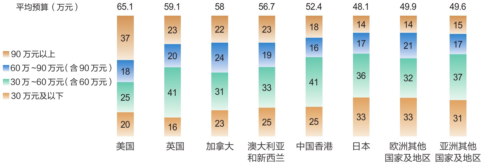 与此同时,可以清晰地看到不同国家和地区留学生在留学费用预算上存在较大差异。对留学美国和英国的人群来说,他们的预算普遍较高。