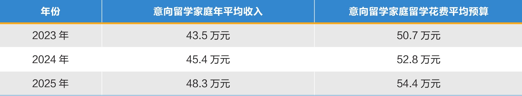 与此同时,留学预算也随之增长。2025年,意向留学家庭的平均年收入为48.3万元,而他们的留学预算则高达54.4万元。这意味着许多家庭在规划子女留学时,都会预留出一定的经济空间。这种对教育的投资意识体现了家长对子女未来的期望和信心。