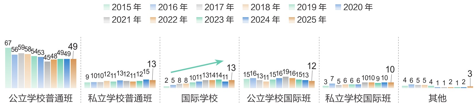 与此同时,来自公立学校国际班的学生自2021年起连续五年下降,这可能是受到全球经济形势的不确定性以及国内经济下行的压力影响,导致许多家庭对留学投资持相对保守的态度。伴随着国内中外合作办学的蓬勃发展,不少家庭也把目光投向相对更具性价比的中外合作办学的学校类型上。
