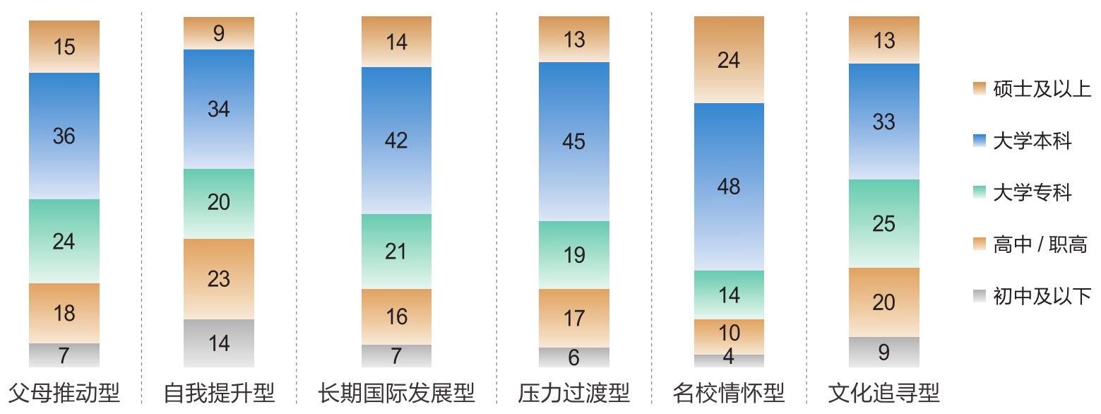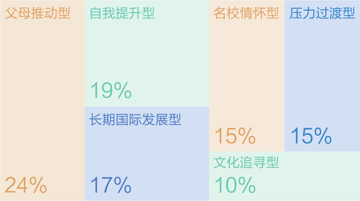 不同的成长经历、家庭环境以及教育目标造就了不同的人群类型。在当下的留学市场中,中国留学生人群主要可以分为六种类型,分别为“父母推动型”“自我提升型”“长期国际发展型”“压力过渡型”“名校情怀型”以及“文化追寻型”。其中,只有24%的人群在留学这件事上是主要由家长推动的,大部分意向留学人群都是依据自己的理想或目标主动选择留学这条路径。