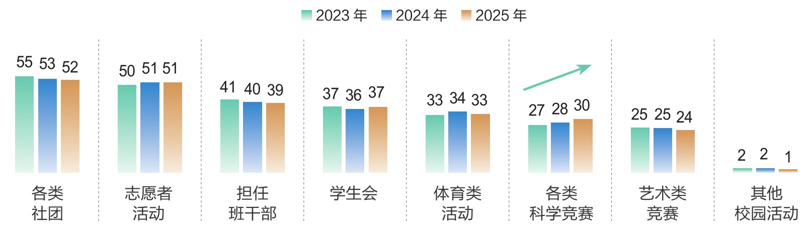 与此同时,参与科学竞赛的人数占比增长明显。这类活动虽然对学生的专业知识和技能的要求较高,但同样也是学生学术水平的有力证明,对未来申请海外优质院校有较大助力。
