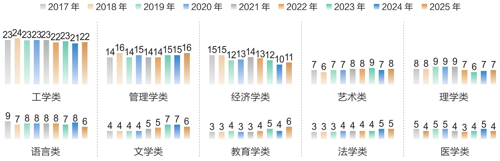 十一年来,意向留学生就读专业仍然集中在工学、管理学和经济学等传统热门领域。这些领域通常能提供较好的就业前景和较高的薪资待遇,因此吸引了大量学生关注。但从2020年开始,可能由于受到国际经济形势影响,经济学专业占比呈小幅下滑,但在2025年又有了回暖,这也预示了未来经济形势有向好趋势。与此同时,管理学、理学、教育学专业学生的留学趋势也在近几年有不同程度的增长,这在一定程度上体现出了国内教育体系的微小调整以及学生兴趣和职业规划的变化。