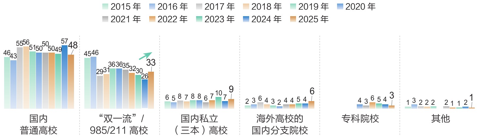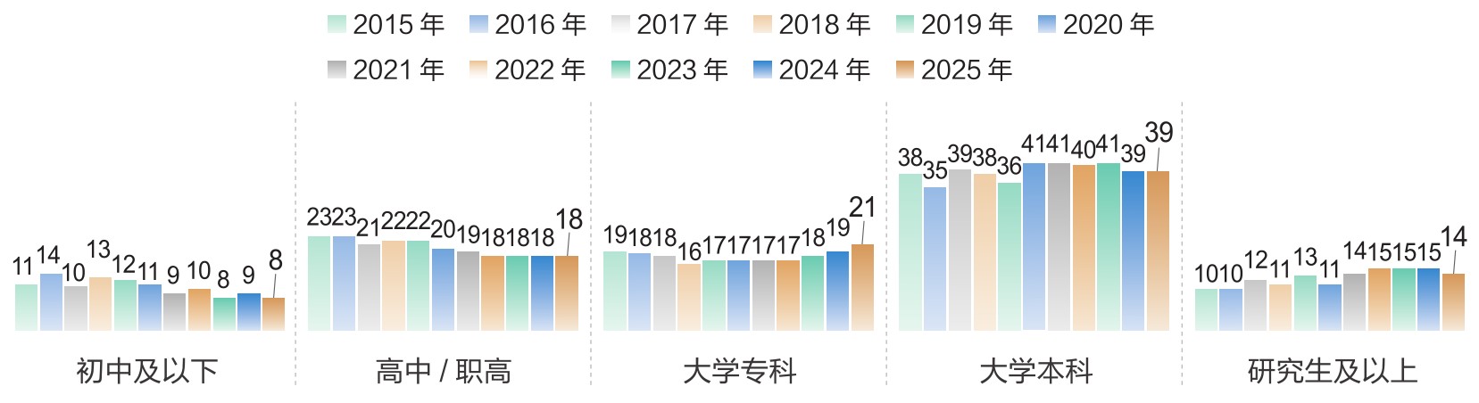 在本科及以上学历的意向留学人群中,来自国内普高的学生占比一直在半数左右,趋于稳定。但在2025年,来自“双一流”高校的学生表现出强烈的留学意向,这可能与全球公共卫生环境的全面恢复、海外高校留学政策的调整以及国际学术交流的恢复有关。“双一流”高校的学生通常具有更高的学术素养和更强的科研能力,留学可以为他们提供更广阔的学术视野和更多的职业发展机会,留学意向的回升也反映出这类学生及其家长对国际教育的认可和期待。