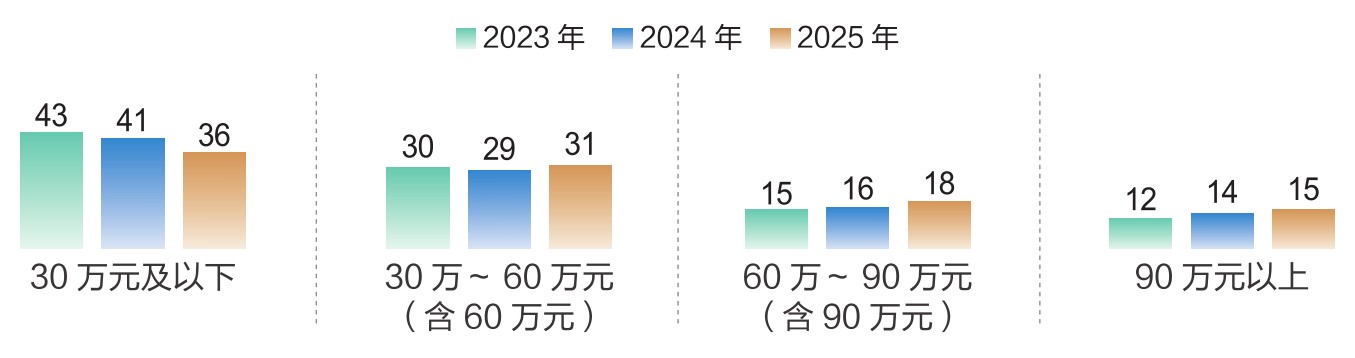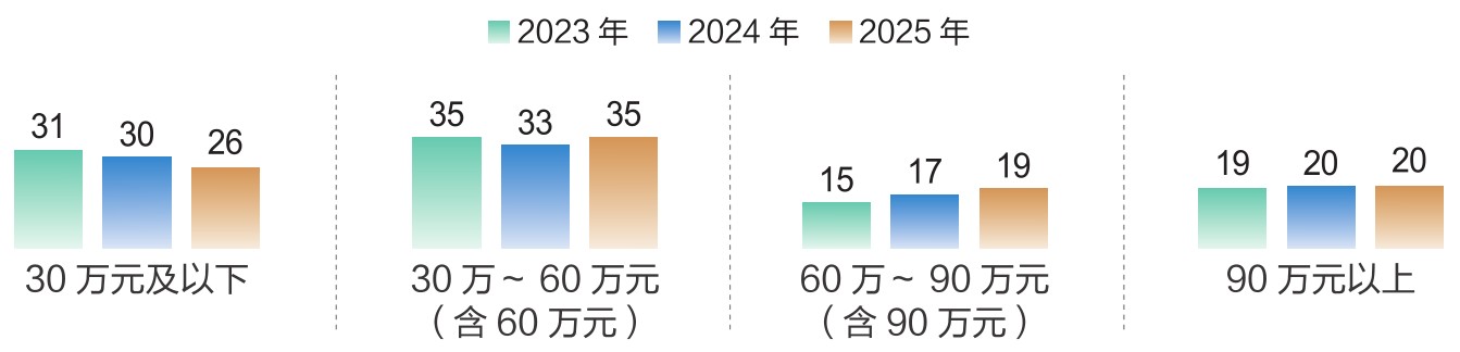 从2025年调研数据来看,当前意向留学家庭的收入分布多样化。年收入在60万元及以下区间的工薪家庭为留学主力。