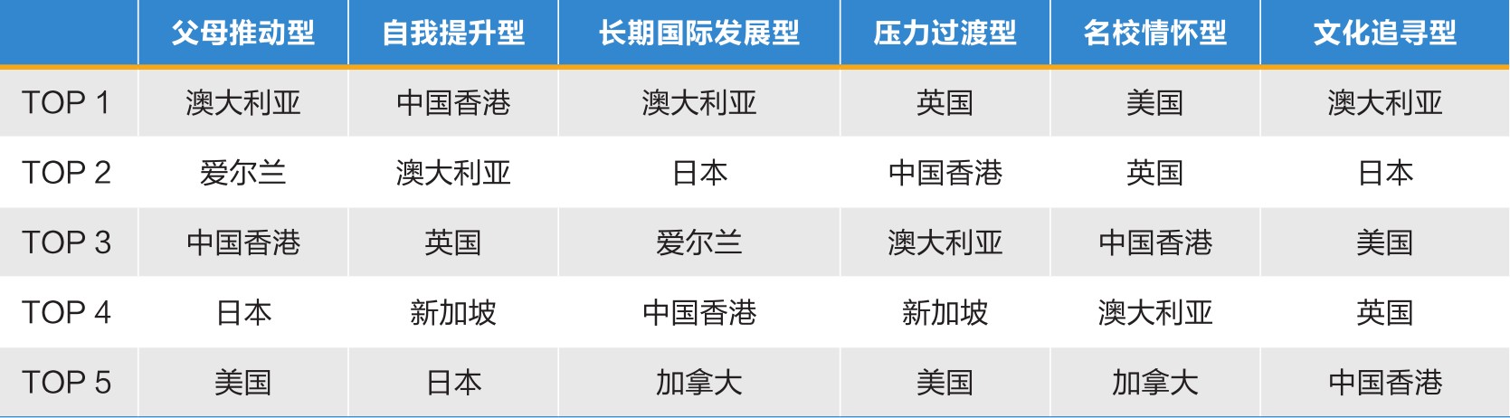 总体来看,英国、美国、澳大利亚等地因其优质的教育资源和良好的生活环境而备受中国留学人群青睐。其中,澳大利亚因其相对灵活简单的申请流程,以及相对亲民的学费和生活费,使多个人群类型表现出较高的意向率,如“父母推动型”和“长期国际发展型”等。