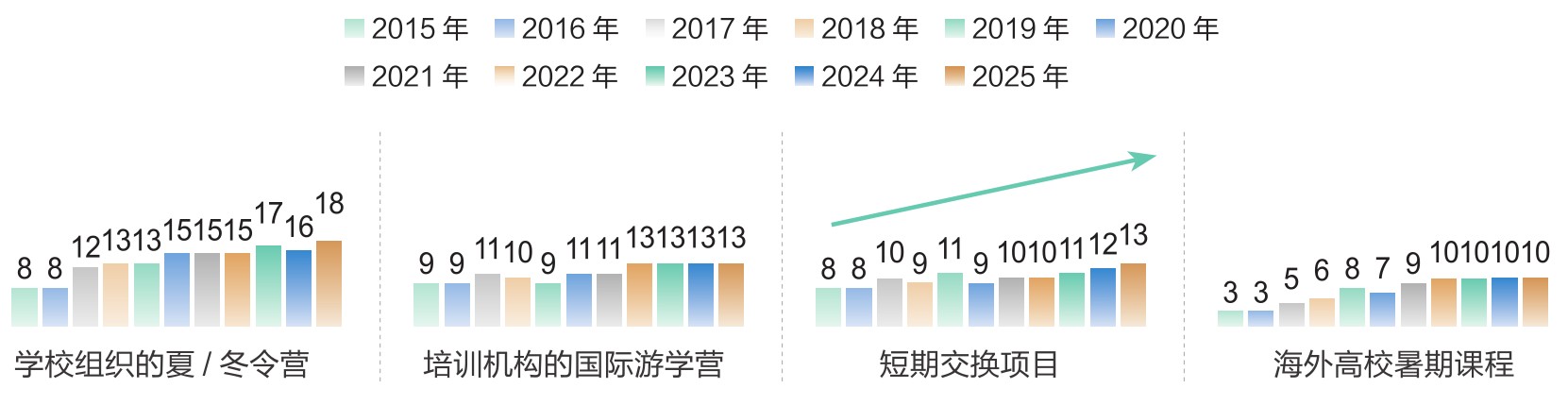 在这些海外学习项目中,夏/冬令营和国际游学营是学生参与较多的国外学习项目。这些项目通常时间较短,但能够让学生快速了解国外的教育体系、文化和生活方式,为他们未来的留学做好充分的准备。此外,短期交换项目也受到了越来越多学生的青睐,参与人数占比连续四年增长明显,这也反映出学生们对国外教育的兴趣和需求在不断增加。