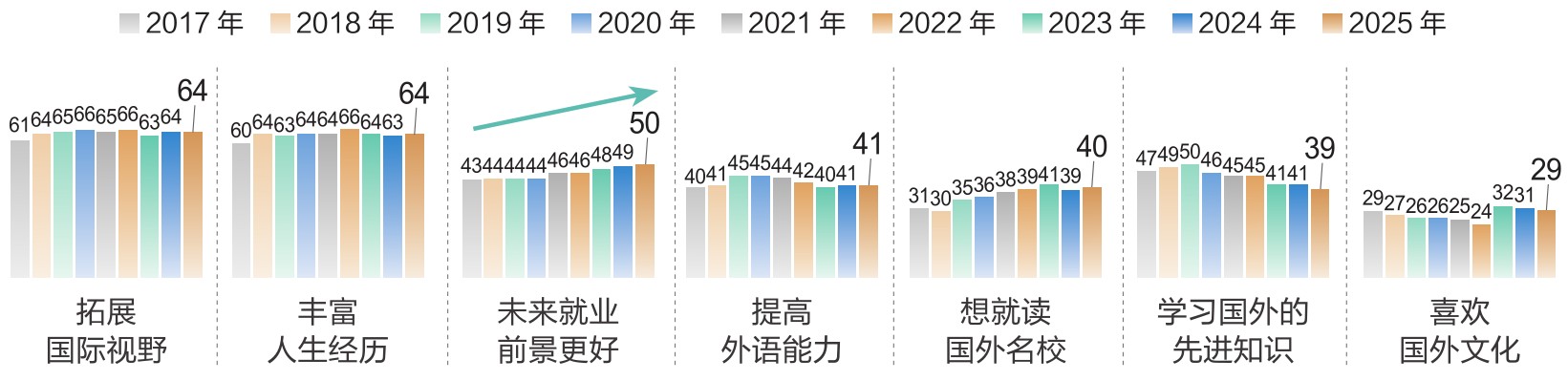 九年来,拓展国际视野和丰富人生经历一直是中国学生赴海外留学的主要留学动机。但随着国内就业竞争加剧,留学动机从对学术的追求转而向就业导向转移,且日趋强烈。提升外语能力和喜欢国外文化等软性文化动机导向呈下降趋势。