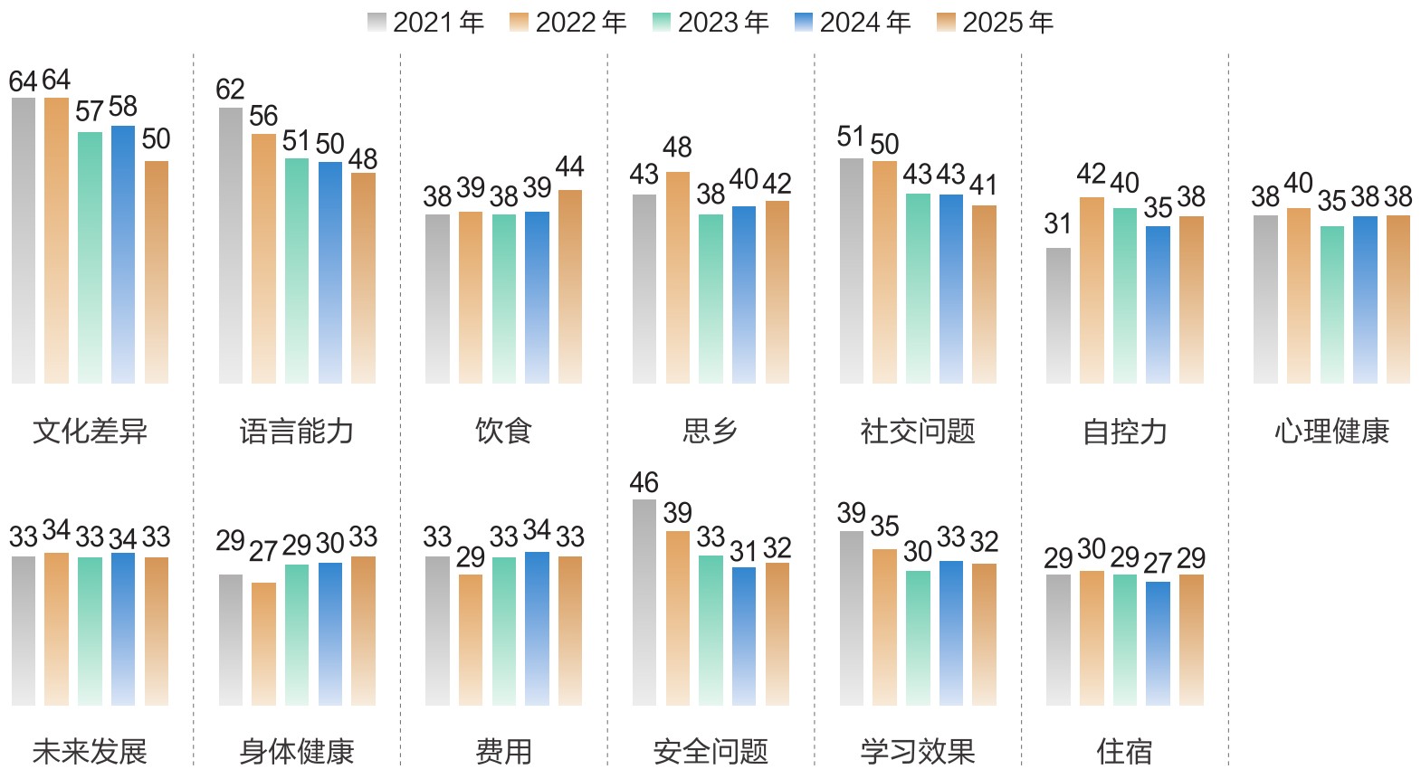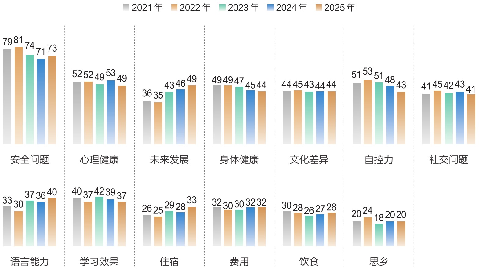 不同角色对留学的主要顾虑是不同的。家长对留学的顾虑主要集中在安全问题、心理健康、未来发展等方面,对于思乡与饮食方面的顾虑则相对较低。与之相反,有越来越多的留学生认为,饮食和思乡已经构成留学期间的主要矛盾,父母担心的安全和心理健康问题,留学生反而并不担心。因此,父母与子女之间需要相互理解,在彼此的沟通中化解因视角差异而造成的误会。