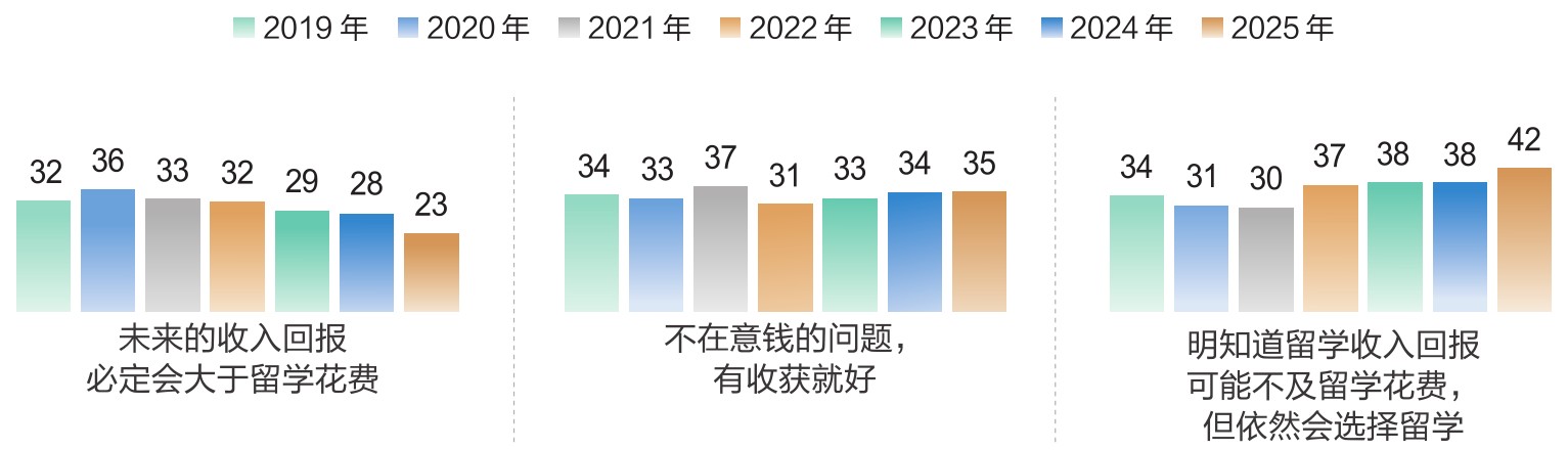 随着留学观念的日渐成熟,越来越多的留学生不再对留学“回本”抱有执念。人生经历、国际化视野等软性收益也越来越被经验人群所重视,因此,持“有收获就好”“明知道留学后收入回报可能不及留学花费,但依然会选择留学”观点的学生比例越来越高。