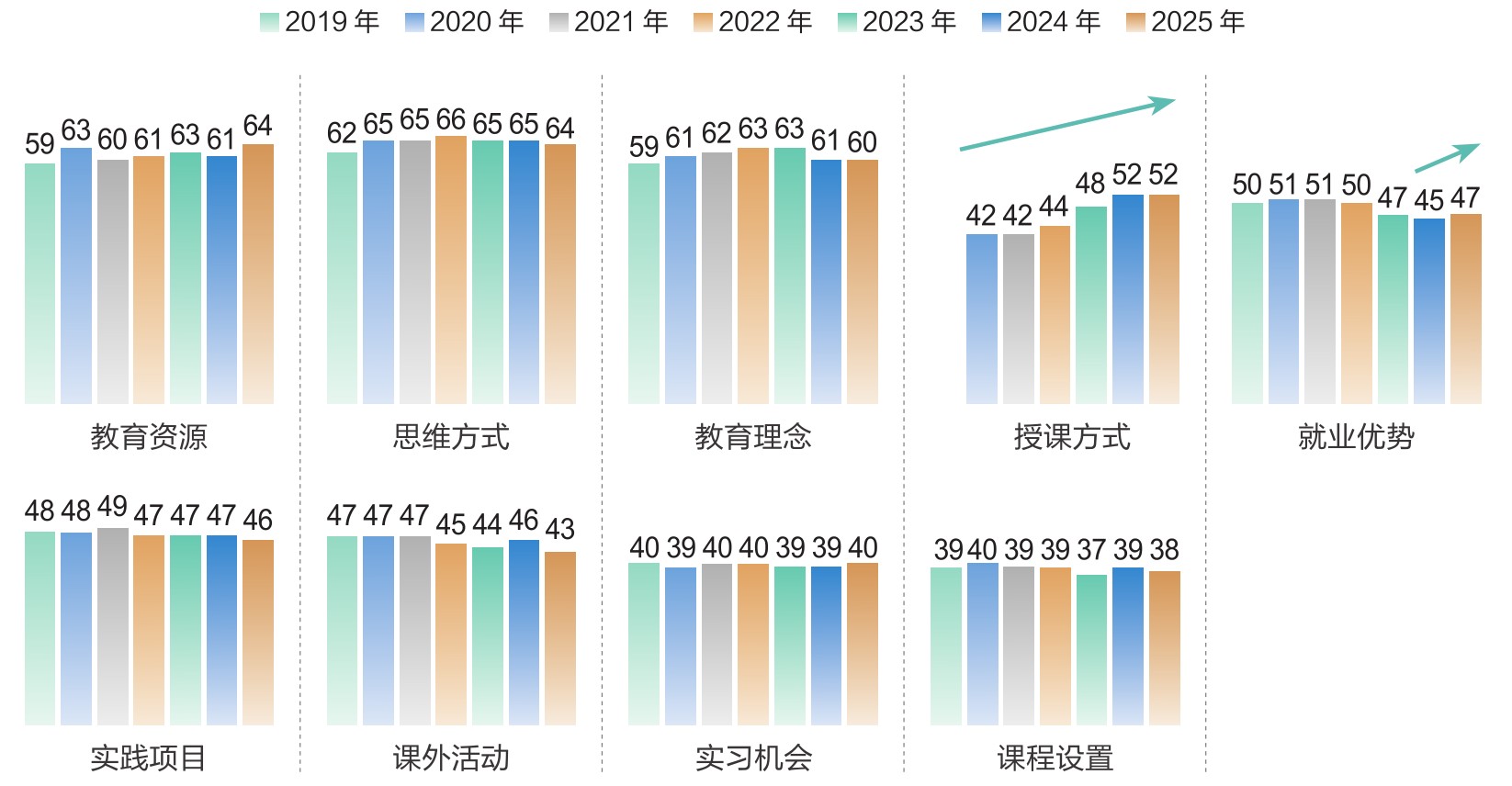 从连续七年的数据来看,意向留学人群认为国外教育的主要优势在于能为他们提供更优质的教育资源、更灵活的思维方式、更先进的教育理念,以及更有竞争力的就业优势。其中,对就业优势的关注度逆势回暖,这也一定程度反映出近两年来愈发激烈的就业竞争环境,有更多的人群期望通过留学获得更好的职业发展。