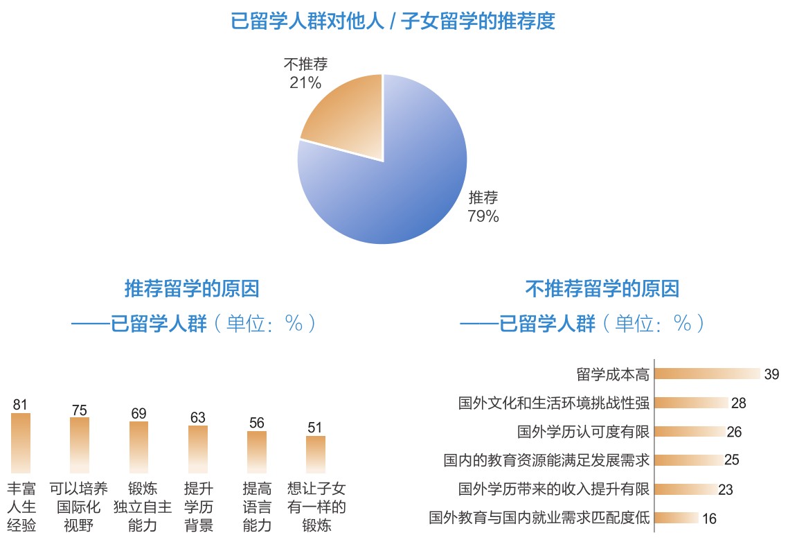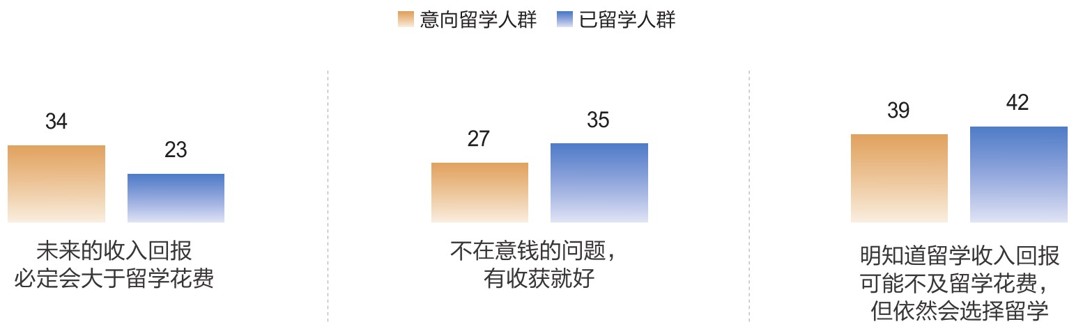 与此同时,从意向留学人群与已留学人群两类群体的观点对比可以看到,已留学人群对花费与回报所持的观点更为成熟与务实。相信随着信息壁垒不断被打破、留学教育体系不断成熟,这种差异最终会被逐渐抹平。