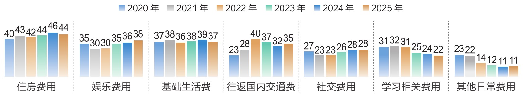 造成留学花费超出预期的主要因素包括住宿费用、娱乐费用和社交费用等。受全球经济下行影响,不少国家物价飞涨,这也给留学生在日常生活及住宿方面带来了成本的增加。同时,全球公共环境恢复正常秩序之后,人们社交和娱乐的渠道与动机呈爆发性增长,因社交娱乐而造成的超支比例逐年增高。
