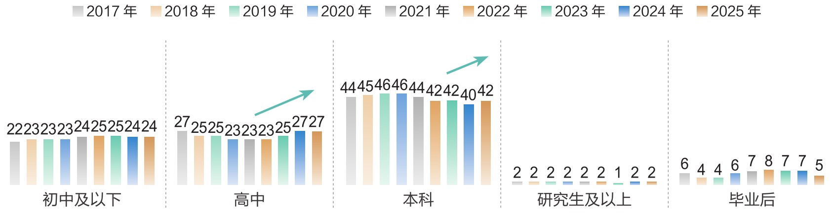 从整体趋势来看,初、高中学生的留学意向呈现稳步上升的趋势,这可能与家长们对孩子教育的国际化视野逐渐增强有关,他们希望孩子能够更早地接触和适应国际化的教育环境。本科阶段产生留学动机的比例在连续五年的下降后出现小幅回升,依旧是中国家庭萌生留学动机的主要阶段。虽然各阶段关系无结构性变化,但是从近几年整体的数据波动可以看出,留学动机低龄化趋势愈发明显。