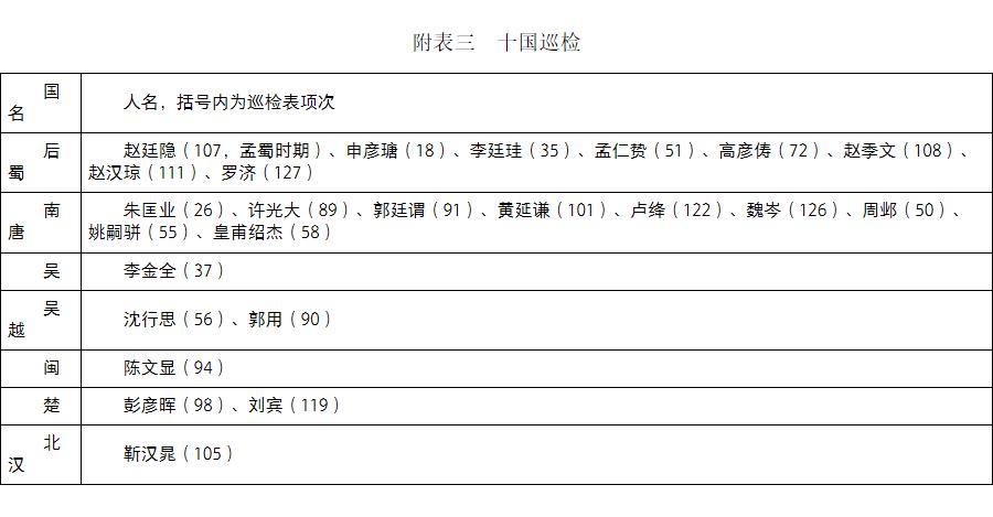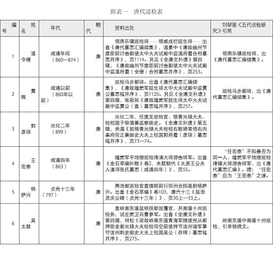 五代是巡检制度由唐末萌芽至制度初创的阶段,仍存在许多过渡时期的特征。一方面,巡检在官制上职能多样,既有维持地方治安的低阶官员,也有统领军队、镇守境内重要区域,乃至肩负军事任务、驻置于境外欲征服地区的军事将领,且又以后者为多。各类巡检虽有官阶高低之别,但官阶、层级、任期和隶属关系等,仍未见比较确定的制度。另一方面,设置巡检的地域更为广泛,不仅存在于政权相续的中原王朝,也出现于遍及江南的十国,甚至契丹;惟临时差派性的军事任务显然较多。
