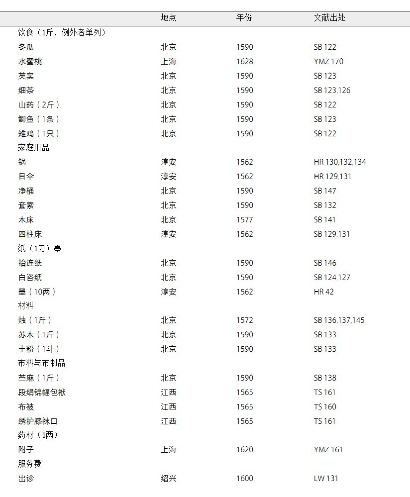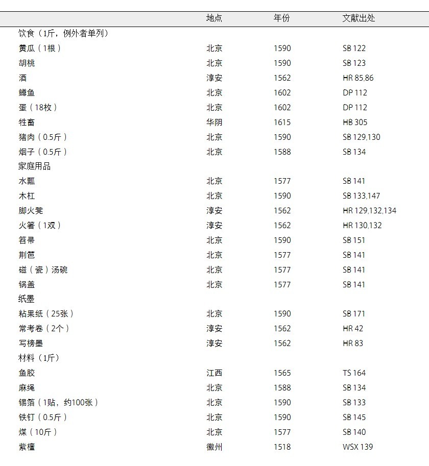 为了直观地总结万历朝的价格体系,我以海瑞、沈榜等人所载的价格数据,梳理出三个表格。第一个表格列出了25种可以用1分白银购买的东西,第二个则为1钱(10分)白银能够购买的东西,第三个是1两(1.3盎司)白银所能购买的东西。