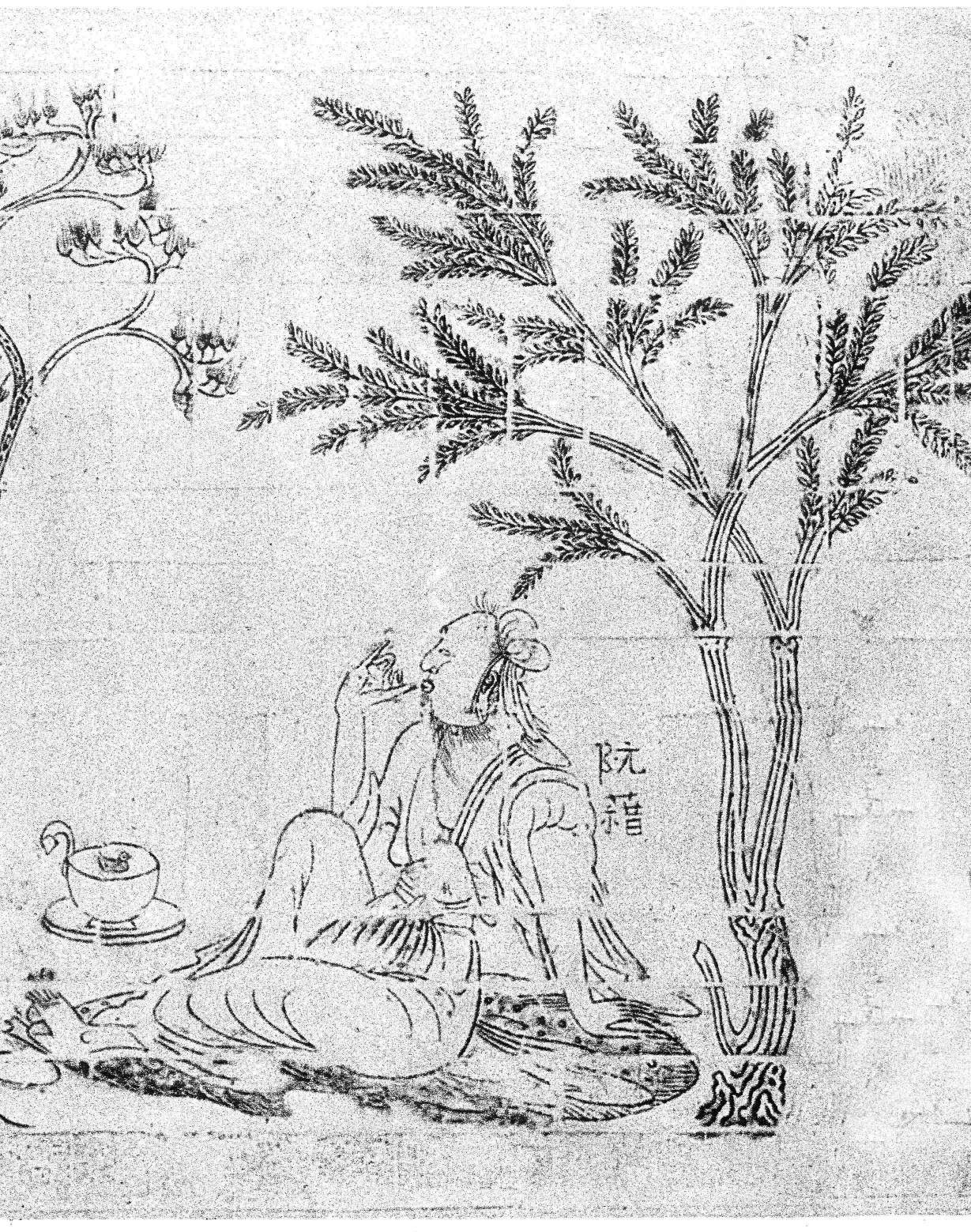 这幅画描绘阮籍作撮口长啸状,右手大小指分别向前后伸出,屈中三指大指抵口唇。可能魏晋名士的“啸”确实如后世打口哨一样,会借用手指干口唇中气流的涌出而发声。