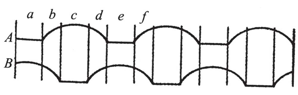 图18 走路时脚部运动的示意图。 A 线代表一只脚, B 线代表另一只脚。直线对应脚踩在地面支撑的瞬间,弧线对应没有支撑的脚部运动的瞬间。从图中可以看出,在时间间隔 a 段,双脚都在地面上;在 b 段时, A 脚在空气中, B 脚继续支撑在地面;在 c 段,两只脚再次站在了地面上。步行速度越快,时间间隔 a 、 c (对照跑步示意图,图20)就越短