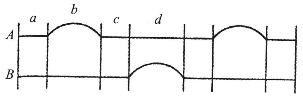 图18 走路时脚部运动的示意图。 A 线代表一只脚, B 线代表另一只脚。直线对应脚踩在地面支撑的瞬间,弧线对应没有支撑的脚部运动的瞬间。从图中可以看出,在时间间隔 a 段,双脚都在地面上;在 b 段时, A 脚在空气中, B 脚继续支撑在地面;在 c 段,两只脚再次站在了地面上。步行速度越快,时间间隔 a 、 c (对照跑步示意图,图20)就越短