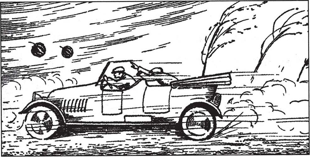 如果子弹在特定条件下可以变得没有威胁性,那么相反的情况也是可能发生的:以很低的速度扔出“和平的”物体,却会产生破坏性的效果。在列宁格勒—第比利斯(1924年)的汽车比赛中,高加索乡村的农民们向车手扔西瓜、甜瓜和苹果,表示欢迎从身边疾驰而过的汽车。这些无害的礼物并没有令人感到愉快:西瓜和甜瓜砸瘪、压坏和打破了车身,苹果落到了车手身上,造成了严重的伤害。发生这件事的原因很清楚:汽车自身的速度加上被扔出的西瓜或苹果的速度,将它们变成了危险的、有破坏性的炸弹。不难计算出,10克重的子弹的运动能量与以120千米/小时的速度向汽车投掷的4千克西瓜的运动能量相同,但西瓜在这种条件下的穿透效果不能与子弹相比,因为西瓜没有子弹那么硬。