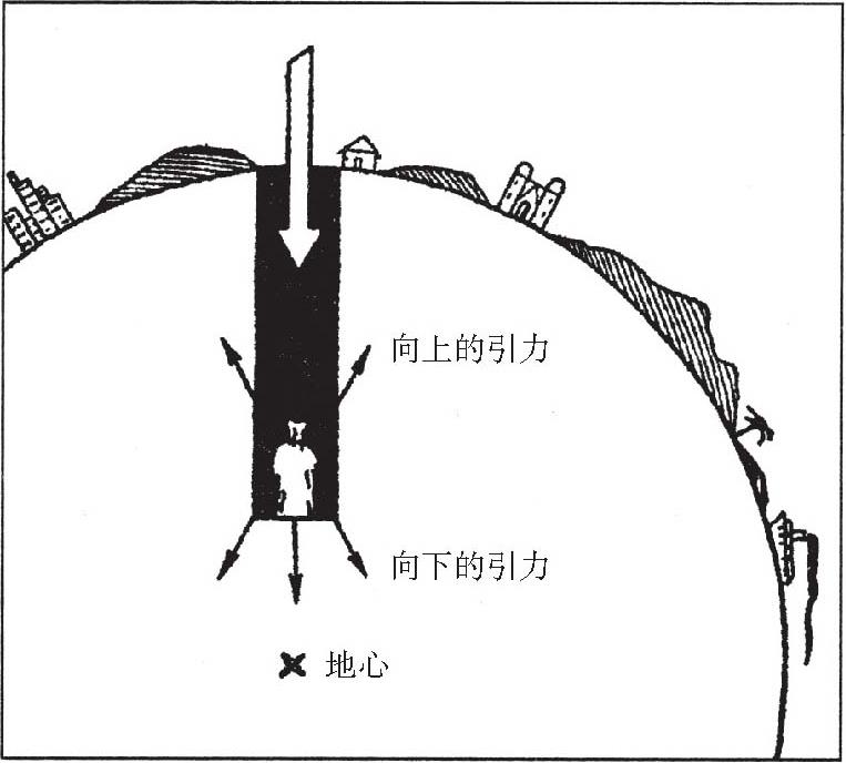 我们很自然地会认为,当砝码深入地球内部,更接近地心时,引力应该增加:地球深处的砝码应该更重。这个猜测是不正确的,随着砝码在地下的深度增加,重量并没有增加,而是减少了。