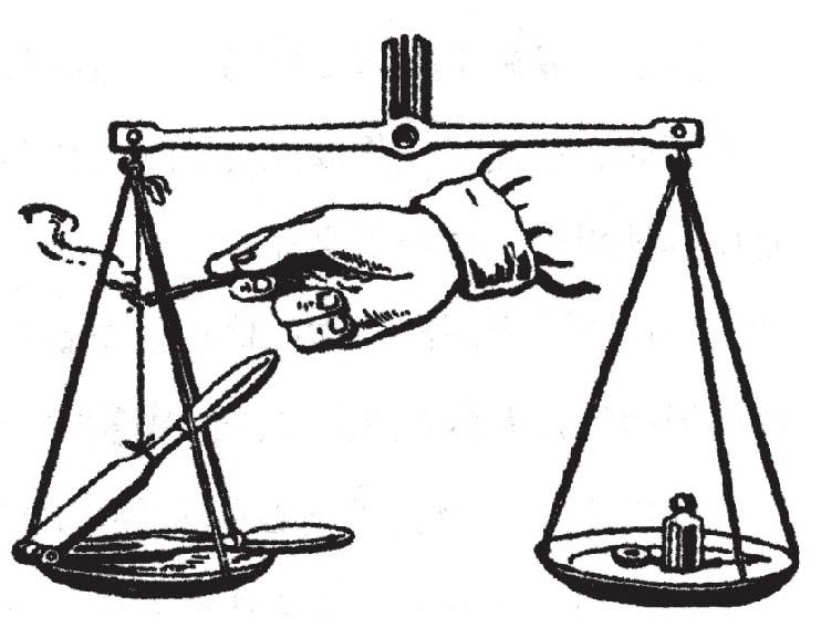 把一个夹碎胡桃用的铁钳这样放在天平一边的秤盘上,使它的手柄在秤盘上,另一头用绳子挂在天平横杆的钩子上(图24)。在另一边秤盘上放足够的重量,使天平保持平衡。把一根点燃的火柴放在绳子上;绳子会被烧断,铁钳上面那截也会掉在秤盘上。