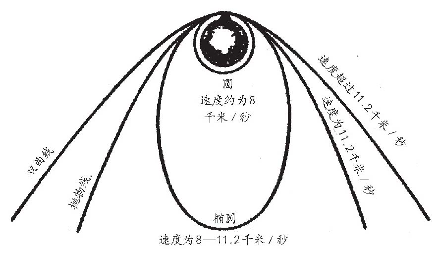 如果把炮弹以更快的速度发射出去,它会飞到哪里?天体力学证明,在炮弹从炮膛射出时速度是8—9千米/秒甚至10千米/秒的条件下,炮弹会绕着地球以椭圆轨道飞行,而且初始速度越快,椭圆轨道就越大。如果炮弹在11.2千米/秒的速度下,它将沿着一条不闭合的曲线——抛物线,而不是椭圆轨道飞行,永远离开地球(图26)。