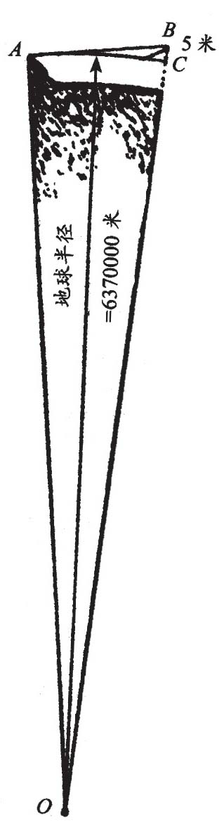 接下来只需要计算 AB 的长度(图25),也就是炮弹一秒钟沿水平方向通过的距离;然后我们就会知道,为了达到我们的目标,必须以多快的秒速度将炮弹发射出来。从三角形 AOB 中计算出来并不困难,其中 OA 是地球的半径(约6370000米); OC = OA , BC =5米;因此, OB =6370005米。根据毕达哥拉斯定理(勾股定理),我们可以得出 AB 2 =6370005 2 -6370000 2 。