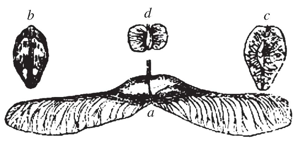 图34 会滑翔的植物种子; a ——槭树的翅果, b ——松树种子, c ——榆树种子, d ——白桦树种子