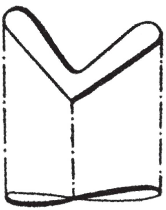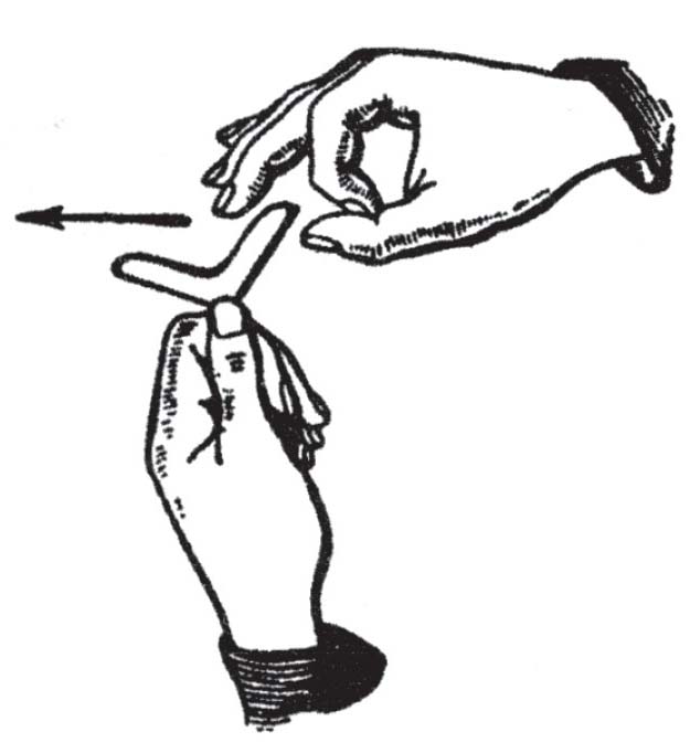 为了在室内练习,您可以按照图36所示的样式,用一张明信片做一个纸回旋镖。回旋镖每个翅膀长约5厘米,宽略小于1厘米。把这样一个纸回旋镖夹在拇指指甲下,弹它的尖端,使其受到向前和微微向上的力。回旋镖会飞行约5米,流畅地画出一条曲线,有时曲线还相当奇特,如果它没有碰到房间里的任何东西,它会落回在您的脚下。
