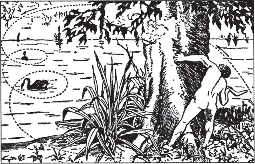 图35 澳大利亚人在掩护物后面使用回旋镖来打猎。回旋镖(如果没有击中目标)的飞行路径用虚线表示