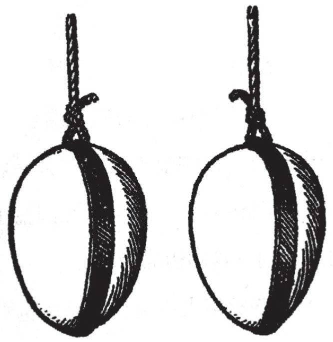 这种实验也可以用其他方式进行。把生鸡蛋和熟鸡蛋用橡皮圈沿“子午线”包裹起来,并将它们分别挂在两条相同的绳子上(图40)。将两条绳子旋转相同的圈数并松开。熟鸡蛋和生鸡蛋之间的区别会立即显现出来。熟鸡蛋回到初始位置后,将惯性地继续扭转,然后再次反方向扭转——这样反复几次,逐渐减少转数。生鸡蛋只会旋转一两次,在熟鸡蛋停止之前很早就停下来了:这是因为生鸡蛋内部的液体阻碍了它的运动。