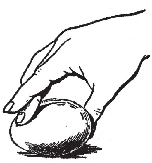 区别在于,煮熟的鸡蛋和生的鸡蛋旋转方式不同。这可以用来解决我们的问题。把鸡蛋放在一个浅盘子上,用两个手指旋转它(图39)。熟的鸡蛋(尤其是煮得全熟的鸡蛋) 明显转得更快,转得更久 。而生鸡蛋甚至都很难转起来。此外,全熟的鸡蛋旋转得如此之快,以至于它的轮廓看起来变成了一个白色扁平的椭圆形,甚至可以用比较小的那头竖起来。