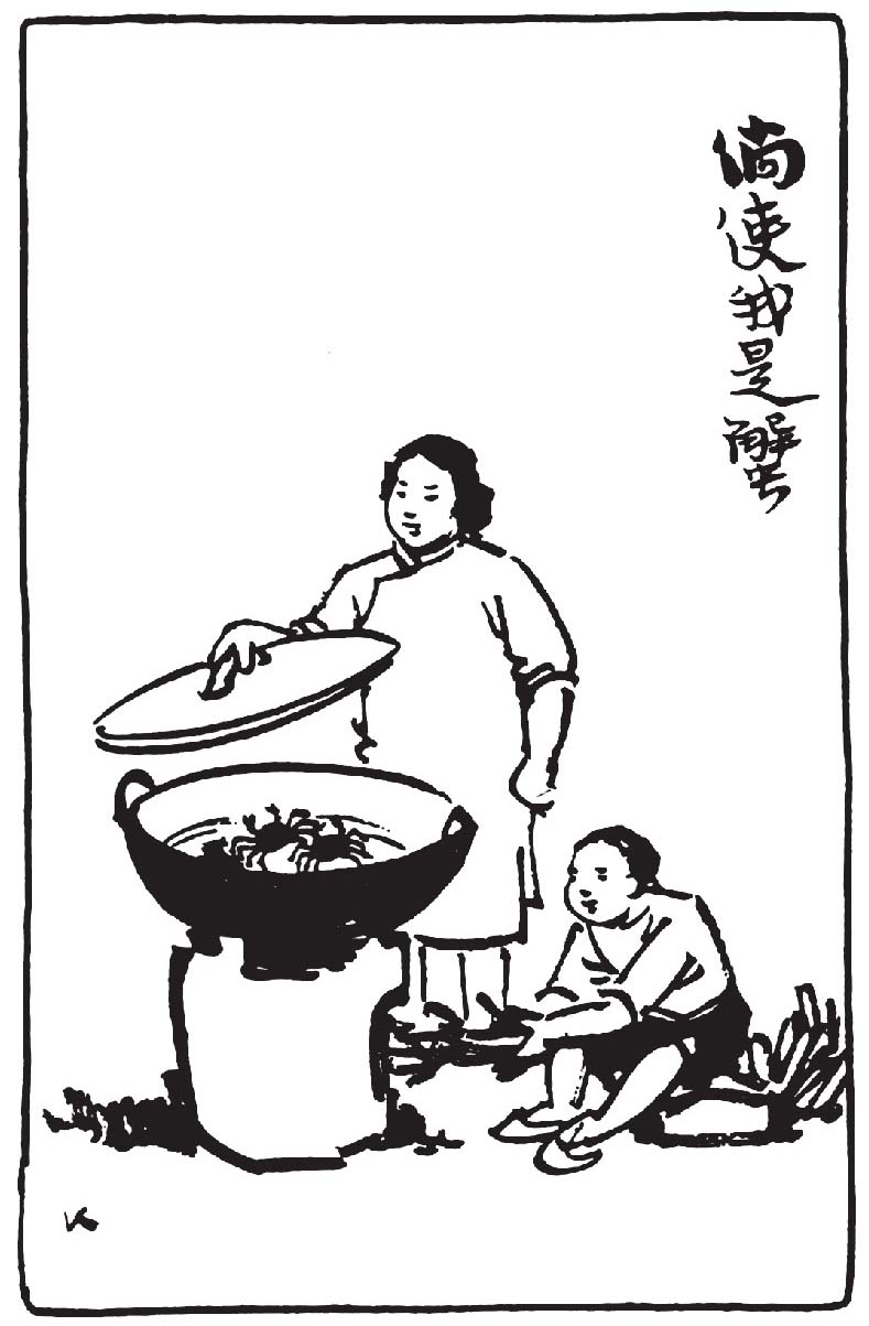 我的父亲中了举人之后,科举就废,他无事在家,每天吃酒,看书。他不要吃羊、牛、猪肉,而喜欢吃鱼、虾之类。而对于蟹,尤其喜欢。自七八月起直到冬天,父亲平日的晚酌规定吃一只蟹,一碗隔壁豆腐店里买来的开锅热豆腐干。他的晚酌,时间总在黄昏。八仙桌上一盏洋油灯,一把紫砂酒壶,一只盛热豆腐干的碎瓷盖碗,一把水烟筒,一本书,桌子角上一只端坐的老猫,我脑中这印象非常深刻,到现在还可以清楚地浮现出来。我在旁边看,有时他给我一只蟹脚或半块豆腐干。然我喜欢蟹脚。蟹的味道真好,我们五个姊妹兄弟,都喜欢吃,也是为了父亲喜欢吃的原故。只有母亲与我们相反,喜欢吃肉,而不喜欢又不会吃蟹,吃的时候常常被蟹螯上的刺刺开手指,出血;而且抉剔得很不干净,父亲常常说她是外行。父亲说:吃蟹是风雅的事,吃法也要内行才懂得。先折蟹脚,后开蟹斗……脚上的拳头(即关节)里的肉怎样可以吃干净,脐里的肉怎样可以剔出……脚爪可以当作剔肉的针……蟹螯上的骨头可拼成一只很好看的蝴蝶……父亲吃蟹真是内行,吃得非常干净。所以陈妈妈说:“老爷吃下来的蟹壳,真是蟹壳。”