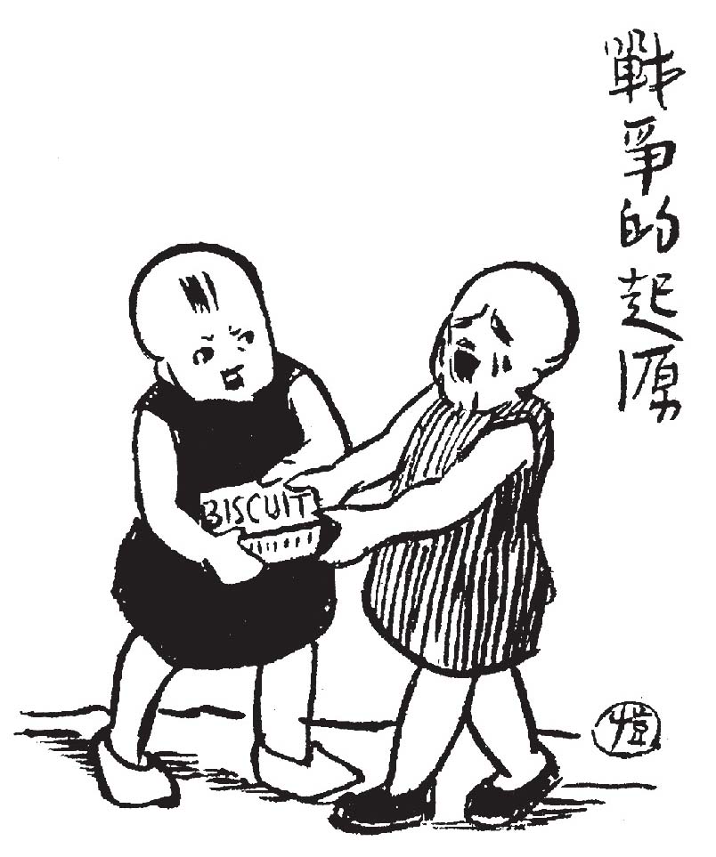 但我到了楼上,并不继续看报。因为我看刚才的事件,觉得比看报上的国际纷争直截明了得多。我想:世间人与人的对待,小的是个人对个人,大的是团体对团体。个人对待中最小的是小孩对小孩,团体对待中最大的是国家对国家。在文明的世间,除了最小的和最大的两极端而外,人对人的交涉,总是用口的说话来讲理,而不用身体的武力来相打的。例如要掠夺,也必用巧妙的手段;要侵占,也必立巧妙的名义:所谓“攻击”也只是辩论,所谓“打倒”也只是叫喊。故人对人虽怀怨害之心,相见还是点头握手,敷衍应酬。虽然也有用武力的人,但“君子开口,小人动手”,开化的世间是不通行用武力的。其中唯有最小的和最大的两极端不然:小孩对小孩的交涉,可以不讲理,而通行用武力来相打;国家对国家的交涉,也可以不讲理,而通行用武力来战争。战争就是大规模的相打。可知凡物相反对的两极端相通似,或相等。国际的事如儿戏,或等于儿戏。