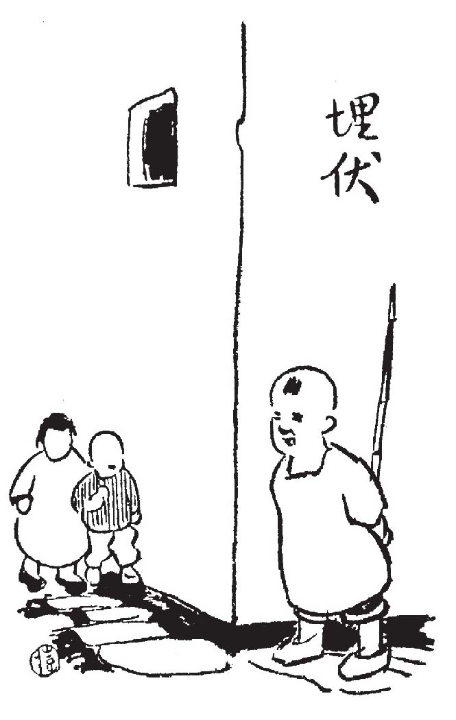他的行为的顽皮,我现在想起了还觉吃惊。但这种行为对于当时的我,有莫大的吸引力,使我时时刻刻追随他,自愿地做他的从者。他用手捉住一条大蜈蚣,摘去了它的有毒的钩爪,而藏在衣袖里,走到各处,随时拿出来吓人。我跟了他走,欣赏他的把戏。他有时偷偷地把这条蜈蚣放在别人的瓜皮帽子上,让它沿着那人的额骨爬下去,吓得那人直跳起来。有时怀着这条蜈蚣去登坑,等候邻席的登坑者正在拉粪的时候,把蜈蚣丢在他的裤子上,使得那人扭着裤子乱跳,累了满身的粪。又有时当众人面前他偷把这条蜈蚣放在自己的额上,假装被咬的样子而号啕大哭起来,使得满座的人惊惶失措,七手八脚地为他营救。正在危急存亡的时候,他伸起手来收拾了这条蜈蚣,忽然破涕为笑,一缕烟逃走了。后来这套戏法渐渐做穿,有的人警告他说,若是再拿出蜈蚣来,要打头颈拳 了。于是他换出别种花头来:他躲在门口,等候警告打头颈拳的人将走出门,突然大叫一声,倒身在门槛边的地上,乱滚乱撞,哭着嚷着,说是践踏了一条臂膀粗的大蛇,但蛇是已经钻进榻底下去了。走出门来的人被他这一吓,实在魂飞魄散;但见他的受难比他更深,也无可奈何他,只怪自己的运气不好。他看见一群人蹲在岸边钓鱼,便参加进去,和蹲着的人闲谈。同时偷偷地把其中相接近的两人的辫子梢头结住了,自己就走开,躲到远处去作壁上观。被结住的两人中若有一人起身欲去,滑稽剧就演出来给他看了。诸如此类的恶戏,不胜枚举。