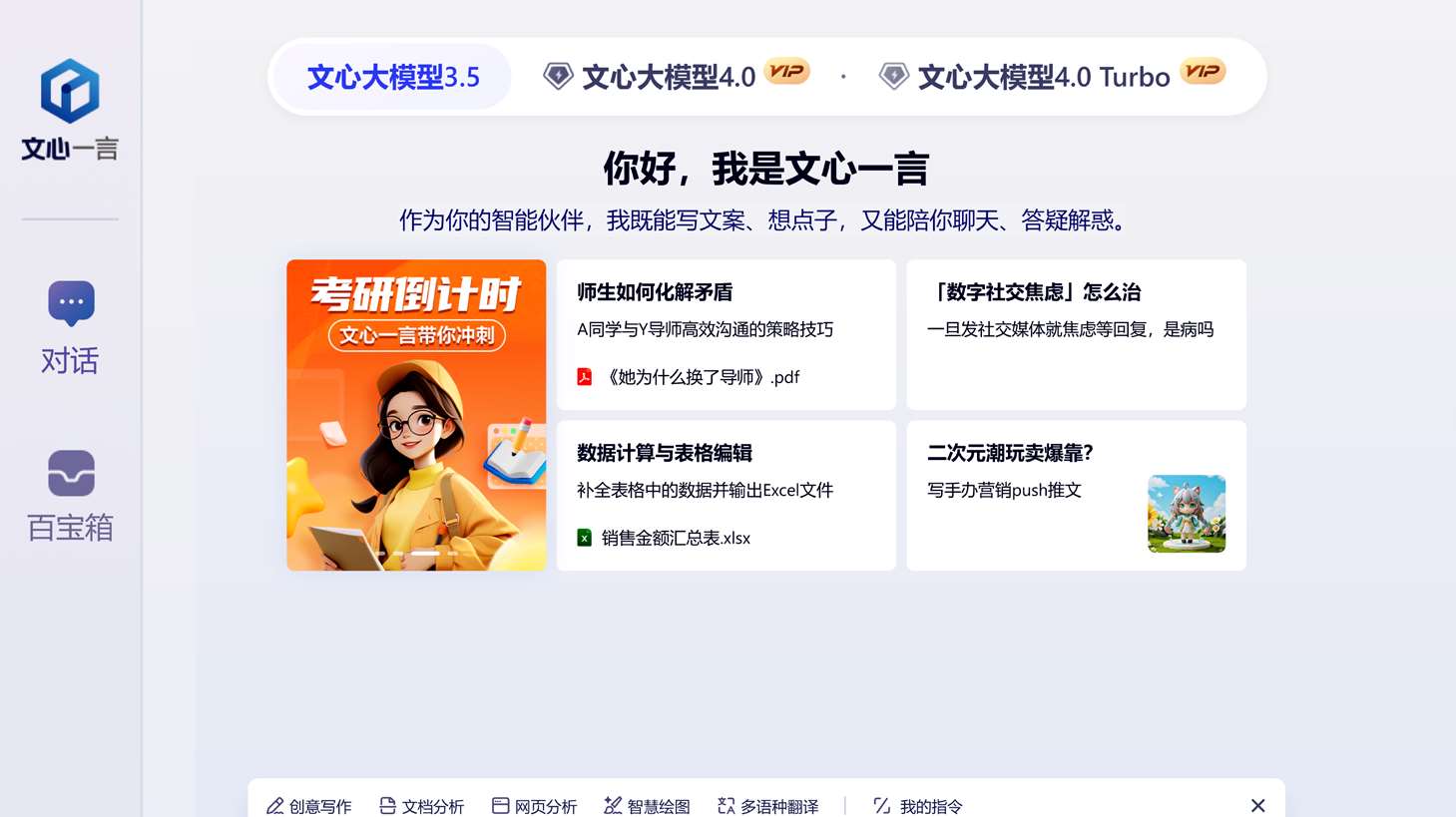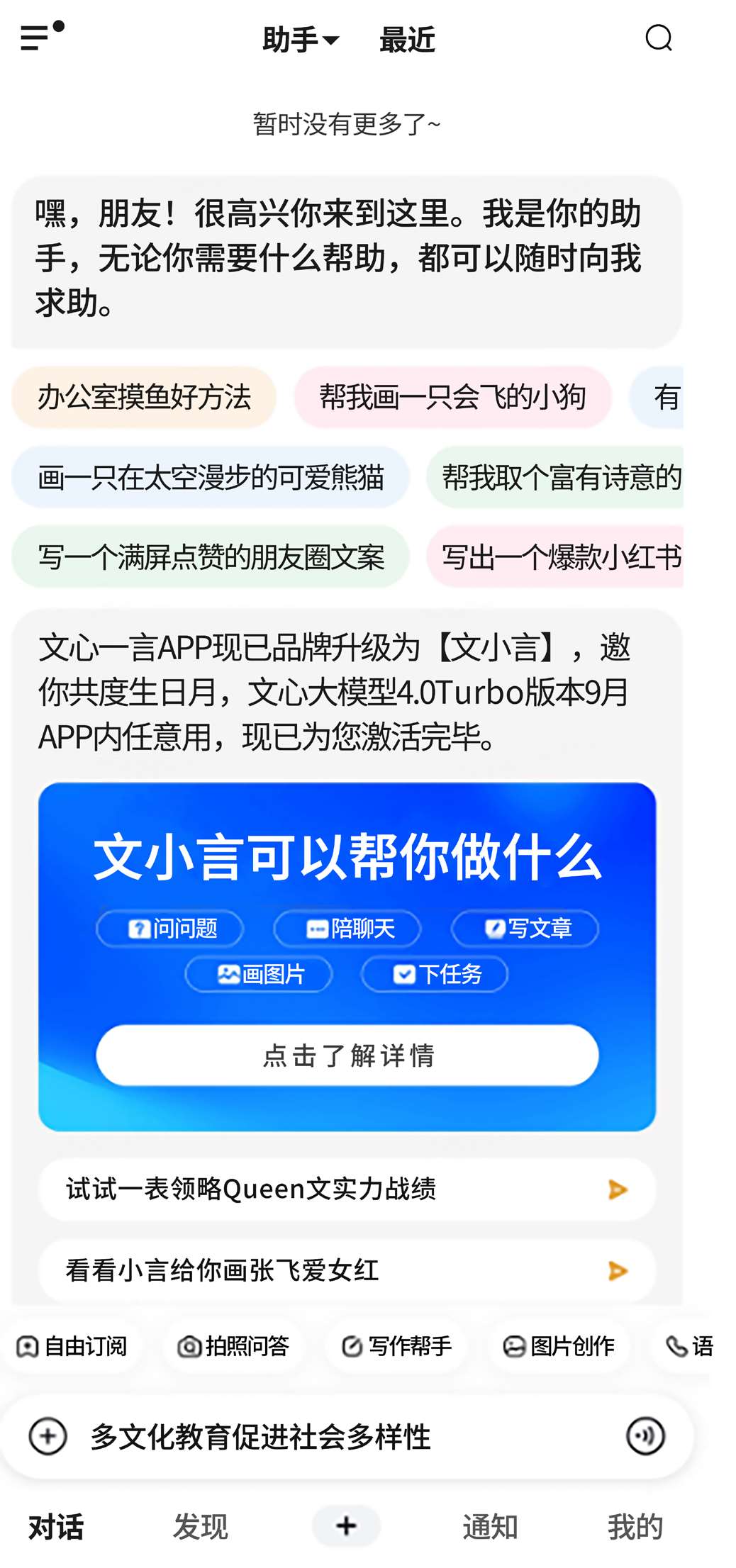 登录之后,我们即可通过手机端的文小言APP进行对话、聊天、拍照问答、图片创作、文档解析等功能,如图2-35所示。