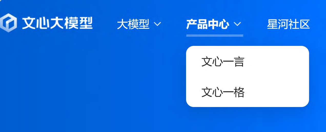 如图2-25所示,将鼠标移动到“产品中心”,会弹出图2-26的菜单选项,分别为“文心一言”和“文心一格”选项,选择“文心一言”即可。