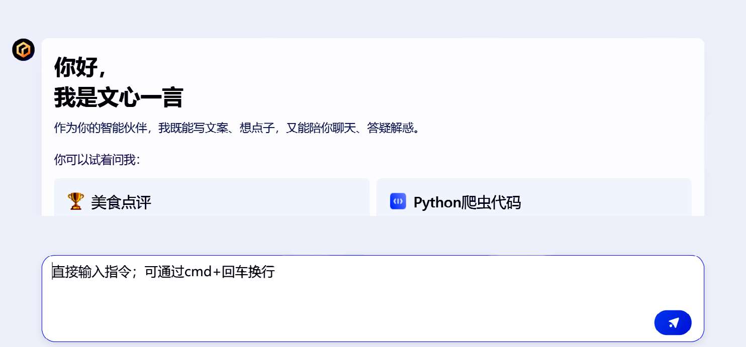 文心一言采用的对话式的聊天场景。文心一言有用、有趣、有温度,既能写文案、读文档,又能脑洞大开、答疑解惑,还能聆听故事、感受新声。可以与人对话、回答问题、协助创作,高效便捷地帮助人们获取知识、信息和灵感。
