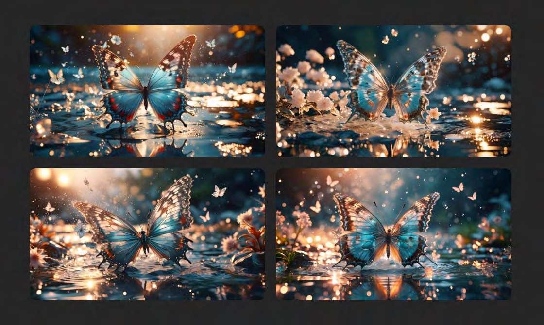 如图2-32,依次选择AI创作、右侧的试一试中“梦幻银蝶”,即可在提示词的描述框中填充润色后的一段提示词“美丽蝴蝶飞舞在渐渐融化的水面上,生动梦幻般的闪光银白色,不敢想象的美丽”,选择画面类型、比例、生成数量后,点击“立即生成”即可生成相关画作,如图2-33所示。