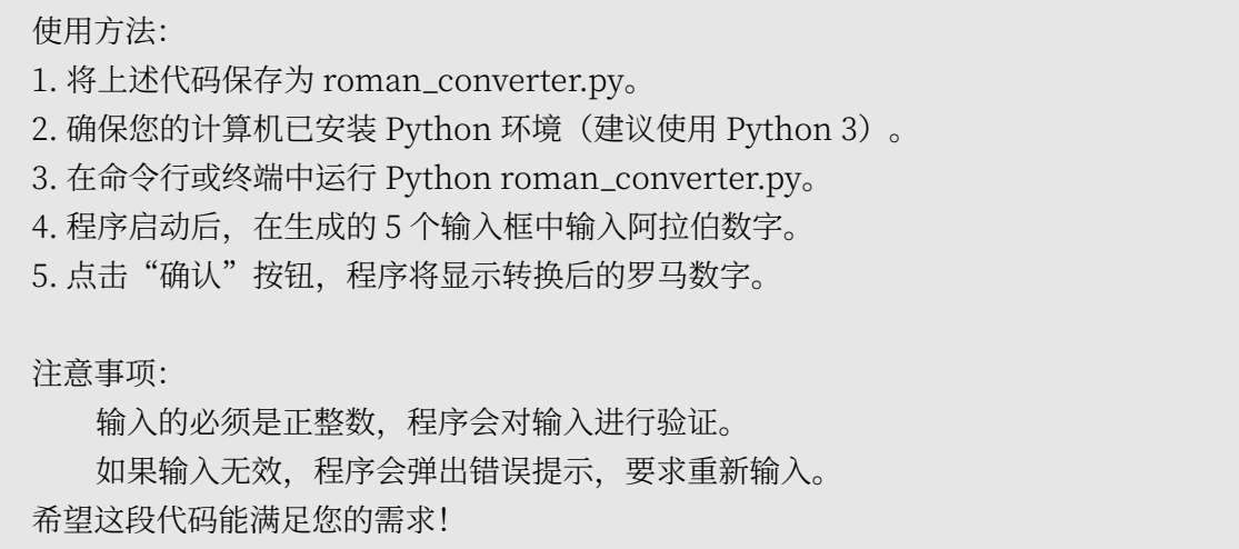 以下是一段使用Python编写的代码,实现了您描述的功能。运行程序后,会生成5个输入框,提示用户输入阿拉伯数字。点击“确认”按钮后,程序将输入的数字转换为罗马数字并显示。