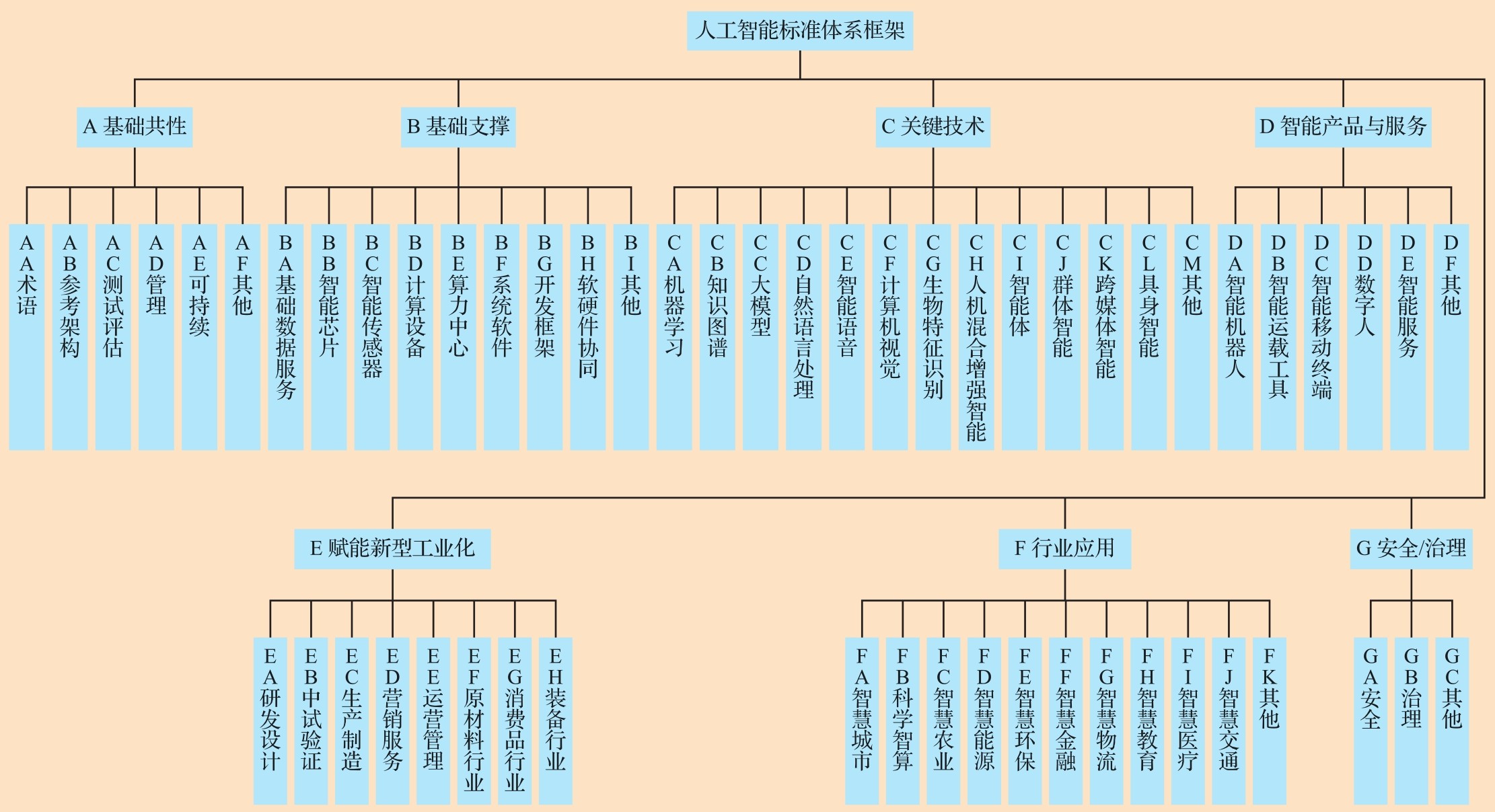 以人工智能标准体系为例,根据《国家人工智能综合标准化体系建设指南(2024版)》,人工智能标准体系包括基础共性、基础支撑、关键技术、智能产品与服务、赋能新型工业化、行业应用、安全/治理共七个部分,人工智能标准体系框架如图5所示。基础共性标准是人工智能的基础性、框架性、总体性标准。基础支撑标准主要规范数据、算力、算法等技术要求,为人工智能产业发展夯实技术底座。关键技术标准主要规范人工智能文本、语音、图像,以及人机混合增强智能、智能体、跨媒体智能、具身智能等技术要求,推动人工智能技术创新和应用。智能产品与服务标准主要规范由人工智能技术形成的智能产品和服务模式。赋能新型工业化标准主要规范人工智能技术赋能制造业全流程智能化,以及重点行业智能升级的技术要求。行业应用标准主要规范人工智能赋能各行业的技术要求,为人工智能赋能行业应用,推动产业智能化发展提供技术保障。