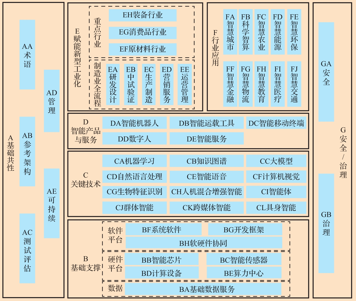 标准体系结构图 用于表达标准体系的范围、边界、内部结构,以及意图。以人工智能产业为例,标准体系结构图如图6所示。