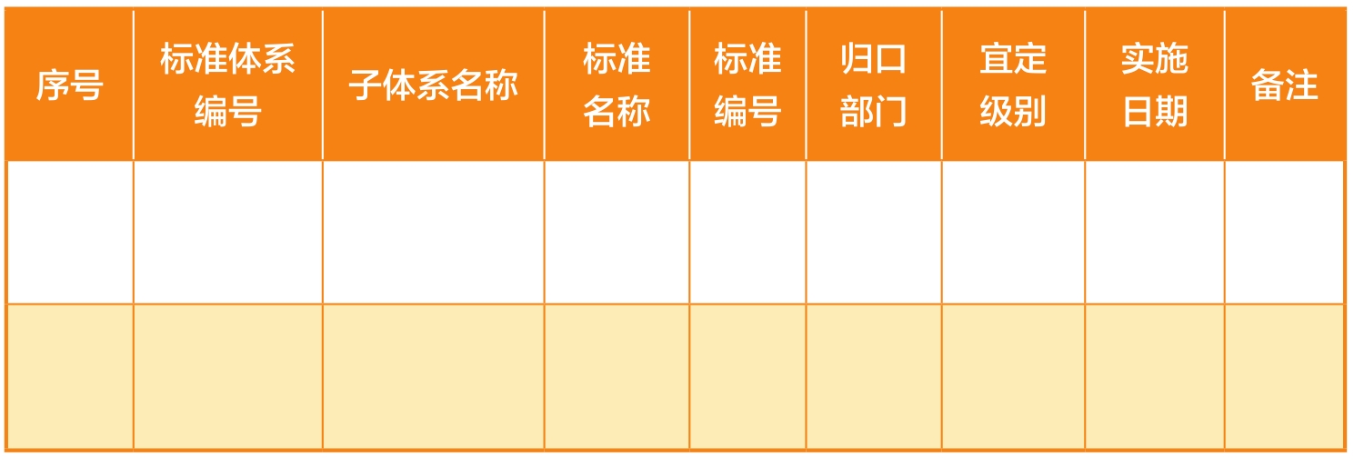 标准明细表 的表头描述的是标准(或子体系)的不同属性。常见的标准明细表的表头包含序号、标准体系编号、子体系名称、标准名称、标准编号、归口部门、宜定级别等内容,标准明细表的一般格式如表6所示。