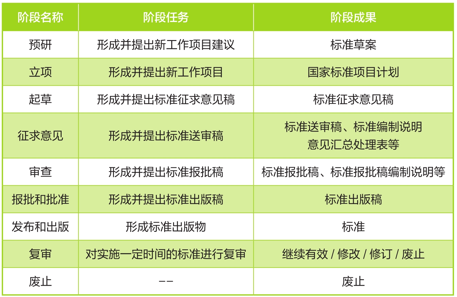 标准制定的常规程序为预研、立项、起草、征求意见、审查、报批和批准、发布和出版、复审、废止共九个阶段。以国家标准为例,一般情况下,标准制定的常规程序如表7所示。